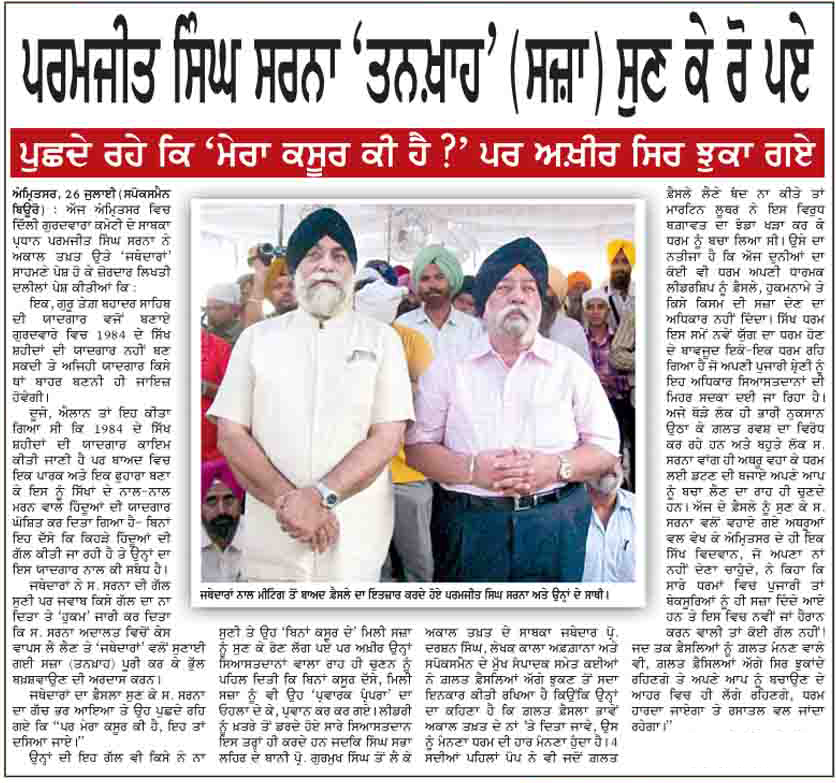 ਅਕਾਲ ਤਖਤ ਤੇ ਸ਼ਕਾਇਤ ਕੀਤੀ ਸੀ ਕਿ ਪਰਮਜੀਤ ਸਿੰਘ ਸਰਨੇ ਤੇ ਮਨਜੀਤ ਸਿੰਘ ਸਰਨੇ ਨੇ