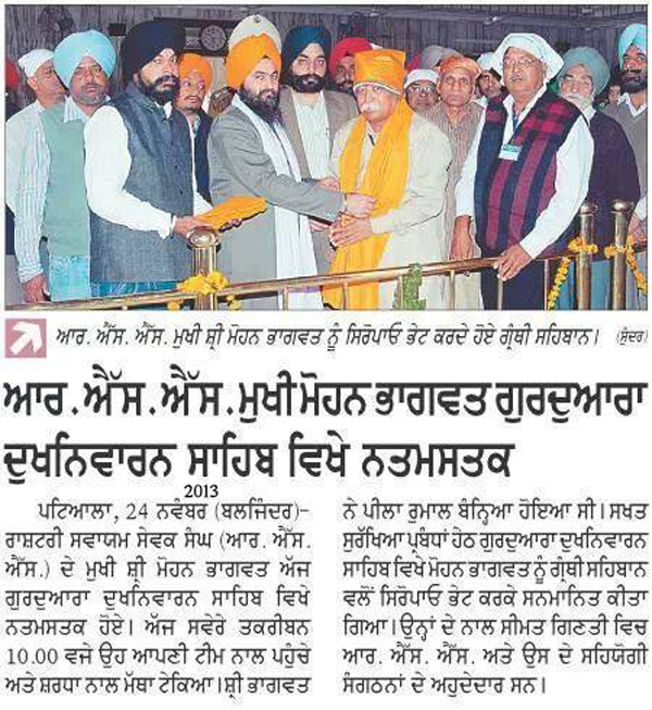 ਆਰ.ਐਸ.ਐਸ. ਮੁੱਖੀ ਮੋਹਨ ਭਾਗਵਤ ਨੂੰ ਸਿਰੋਪਾ ਕਿਸ ਪ੍ਰਾਪਤੀ ਲਈ ਦਿੱਤਾ ਗਿਆ, ਸਿੱਖਾਂ ਨੂੰ ਹਿੰਦੂ ਕਹਿਣ ਲਈ ?