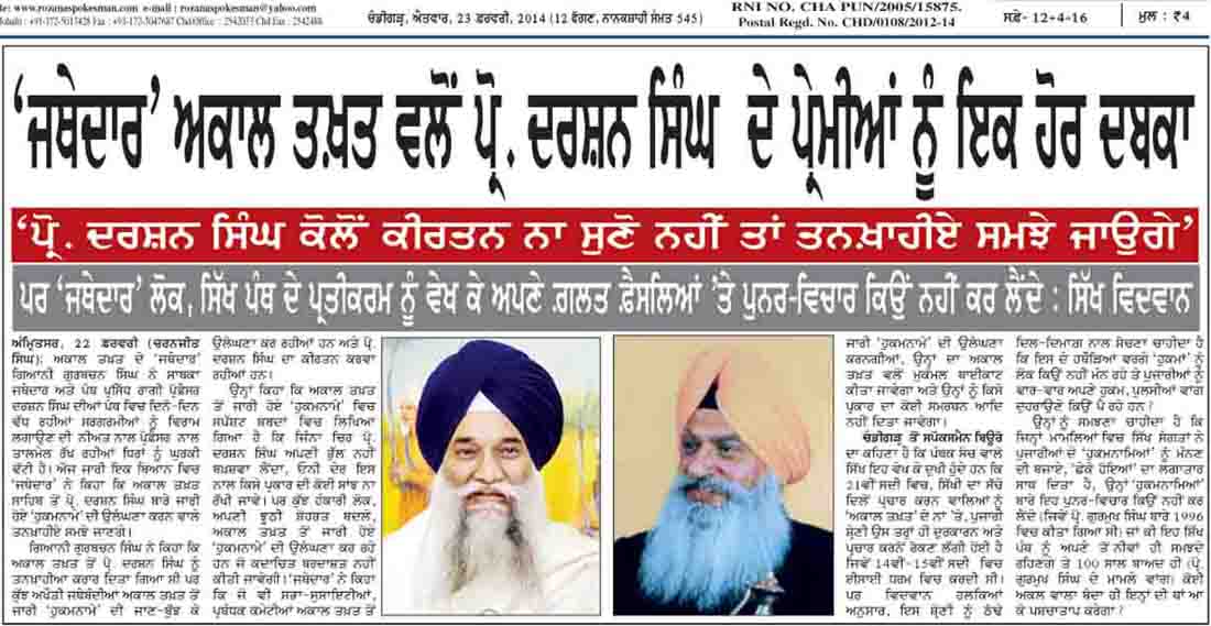 ਕੂੜਨਾਮੇ ਤੋਂ ਬਾਅਦ ਪ੍ਰੋ. ਸਾਹਿਬ ਦਾ ਕੀਰਤਨ ਕਰਵਾਇਆ ਸੀ ਅਤੇ ਅੱਗੇ ਤੋਂ ਭੀ ਇਹ