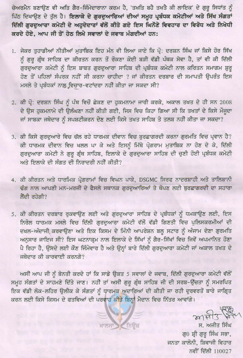 ਦਿੱਲੀ ਕਮੇਟੀ ਵਲੋਂ ਗੁ. ਸ੍ਰੀ ਗੁਰੂ ਸਿੰਘ ਸਭਾ, ਸ਼ਿਵਾਜੀ ਵਿਹਾਰ ਵਿਖੇ ਪ੍ਰੋ. ਦਰਸ਼ਨ ਸਿੰਘ ਖ਼ਾਲਸਾ ਵਲੋਂ ਕੀਤੇ ਜਾਣ ਵਾਲੇ ਕੀਰਤਨ ਦਰਬਾਰ ਵਿੱਚ ਵਿਘਨ ਪਾਉਣ ਸੰਬੰਧੀ ਗੁਰਦੁਆਰਾ ਕਮੇਟੀਆਂ ਅਤੇ ਸਿੱਖ ਸੰਗਤਾਂ ਵਲੋਂ ਰੋਸ ਪੱਤਰ ਅਤੇ ਪੰਜ ਸਵਾਲ