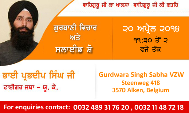 ਸ. ਪ੍ਰਭਦੀਪ ਸਿੰਘ ਟਾਈਗਰ ਜਥਾ, ਖਾਲਸਾ ਸੰਪੂਰਨਤਾ ਦਿਹਾੜੇ ਦੇ ਮੌਕੇ 'ਤੇ 20 ਅਪ੍ਰੈਲ 2014 ਨੂੰ ਬੈਲਜੀਅਮ ਵਿਖੇ ਗੁਰਮਤਿ ਵੀਚਾਰਾਂ ਕਰਨਗੇ