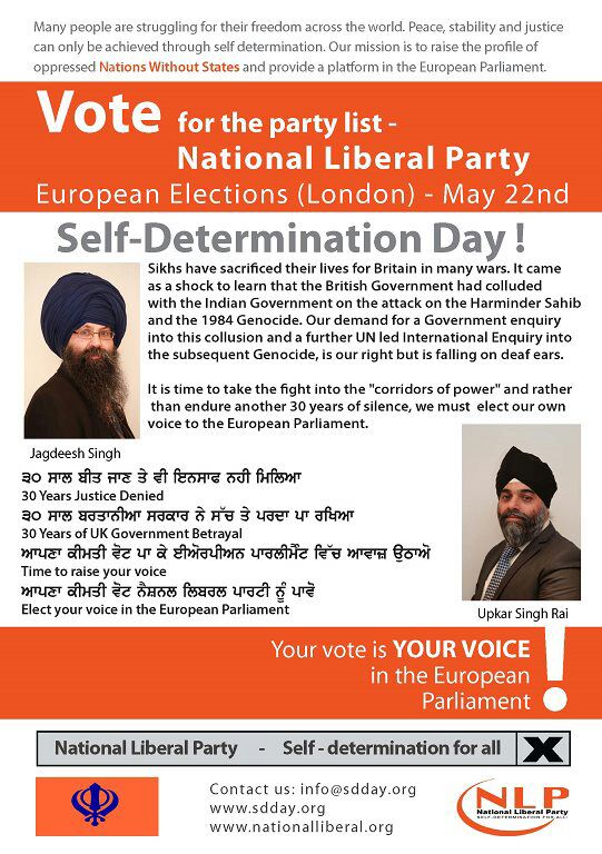 ਲੰਡਨ ਵਿੱਚ ਵੱਸਦੇ ਸਮੂਹ ਸਿੱਖਾਂ ਨੂੰ ਬੇਨਤੀ ਕੀਤੀ ਜਾਂਦੀ ਹੈ ਕਿ ਇਸ ਮਹੀਨੇ 22 ਮਈ 2014 ਨੂੰ ਯੂਰੋਪੀਅਨ ਪਾਰਲੀਮੈਂਟ ਦੀ ਇਲੈਕਸ਼ਨ ਲੜ ਰਹੇ ਆਪਣੇ ਦੋ ਸਿੱਖ ਭਰਾਵਾਂ ਨੂੰ ਆਪਣੀਆਂ ਕੀਮਤੀ ਵੋਟਾਂ ਪਾ ਕੇ, ਸਿੱਖ ਕੌਮ ਦੀ ਆਵਾਜ਼ ਨੂੰ ਯੂਰਪ ਦੀ ਪਾਰਲੀਮੈਂਟ ਤੱਕ ਪਹੁੰਚਾਈਏ।