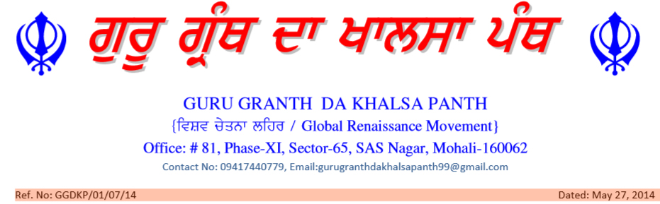 ਸਕੱਤਰ - ਗੁਰੂ ਗ੍ਰੰਥ ਦਾ ਖਾਲਸਾ ਪੰਥ ਵਿਸ਼ਵ ਚੇਤਨਾ ਲਹਿਰ ਅਜੀਤਗੜ੍ਹ, ਪੰਜਾਬ