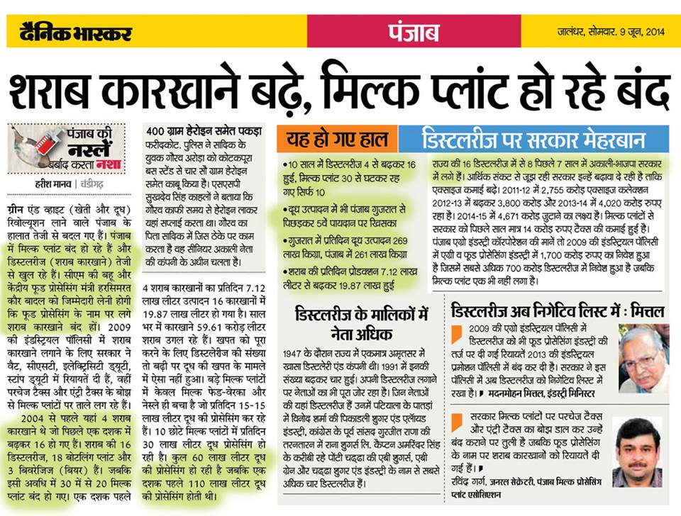 ਰਿਪੋਰਟ ਮੁਤਾਬਿਕ, ਸ਼ਰਾਬ ਦੇ ਬਹੁਤੇ ਪਲਾਂਟਾਂ ਦੀ ਮਲਕੀਅਤ ਸਿਆਸੀ ਆਗੂਆਂ ਦੀ। ਪੰਜਾਬ ਵਰਗੇ ਹਰੇ-ਭਰੇ ਸੂਬੇ ਵਿਚ ਰੋਜਾਨਾ ਦੁੱਧ ਦਾ ਉਤਪਾਦਨ ਮਾਤਰ 261 ਲੱਖ ਕਿਲੋ, ਜਦਕਿ ਗੁਜਰਾਤ ਵਰਗੇ ਸੁੱਕੇ ਅਤੇ ਰੇਤਲੇ ਸੂਬੇ ਵਿਚ ਰੋਜਾਨਾ ਦੁੱਧ ਦਾ ਉਤਪਾਦਨ 269 ਲੱਖ ਕਿਲੋ !! ਜਾਪਦਾ ਹੈ ਕਿ ਪੰਜਾਬ ਦਾ ਬੇੜਾ ਗਰਕ ਕਰਨ ਵਾਲੀਆਂ ਨੀਤੀਆਂ ਅਪਣਾਉਣ ਲਈ ਬਾਦਲ-ਭਾਜਪਾ ਸਰਕਾਰ ਦਾ ਨਾਮ ਗਿੰਨੀਜ਼ ਬੁੱਕ ਆਫ ਵਰਲਡ ਰਿਕਾਰਡ ਵਿਚ ਦਰਜ ਹੋ ਕੇ ਹੀ ਰਹੇਗਾ।
