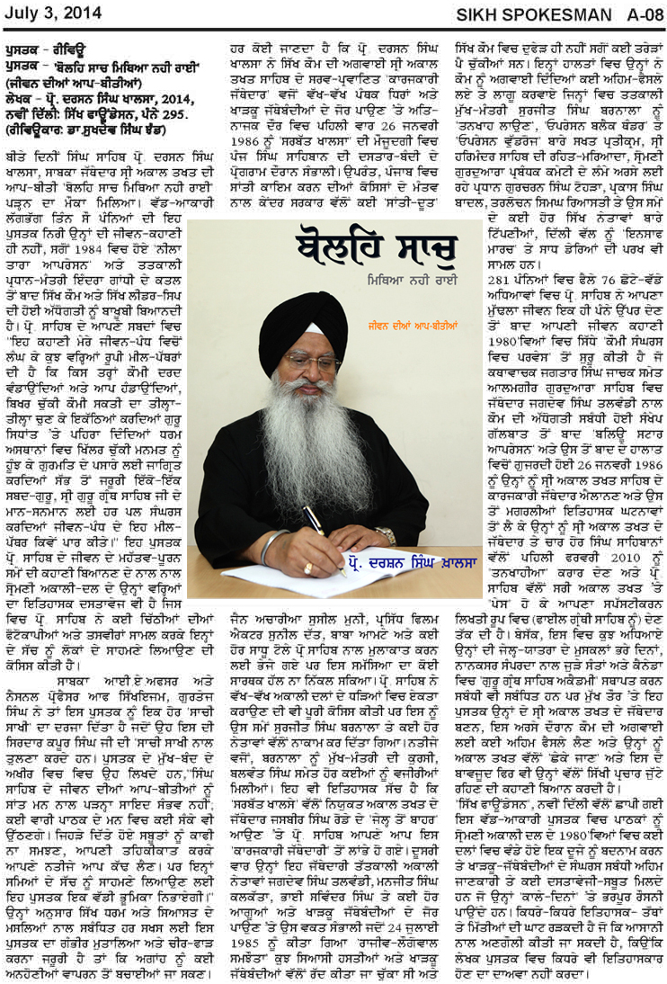 ਪ੍ਰੋ. ਦਰਸ਼ਨ ਸਿੰਘ ਖ਼ਾਲਸਾ ਵਲੋਂ ਲਿਖੀ ਜੀਵਨ ਦੀਆਂ ਆਪ ਬੀਤੀਆਂ "ਬੋਲਹਿ ਸਾਚੁ ਮਿਥਿਆ ਨਹੀ ਰਾਈ" ਪੁਸਤਕ ਦੀ ਸਮੀਖਿਆ