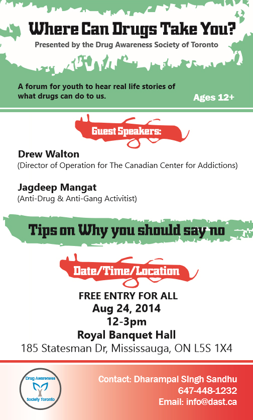 ਨਸ਼ਾ ਤੁਹਾਨੂੰ ਕਿੱਥੇ ਲੈ ਕੇ ਜਾ ਸਕਦਾ ਹੈ? ਜਾਨਣ ਲਈ 24 ਅਗਸਤ 2014 ਨੂੰ ਰੌਇਲ ਬੈਂਕੁਏਟ ਹਾਲ ਪਹੁੰਚੋ