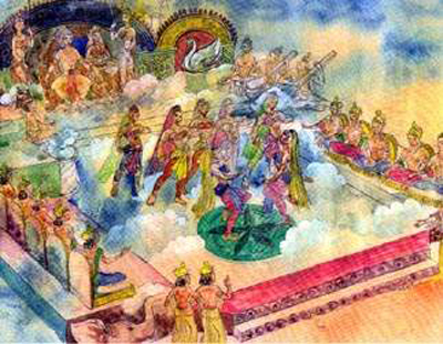 ਰਹੀਆਂ ਹਨ। ਇਹ ਦੇਖ ਕੇ ਰਾਜਾ ਇੰਦ੍ਰ ਪ੍ਰਸੰਨ ਹੋ ਰਿਹਾ ਹੈ । ਇੰਦ੍ਰ ਦੇ ਦਰਬਾਰ ਵਿੱਚ