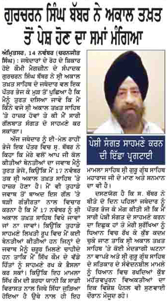 ਭੇਜੋ ਕਿਉਂਕਿ ਮੈਂਨੂੰ 17.11.2014 ਯਾਨੀ ਕਿ ਦੋ ਦਿਨ ਬਾਅਦ ਸ੍ਰੀ ਅਕਾਲ ਤਖ਼ਤ ਸਾਹਿਬ ਤੇ