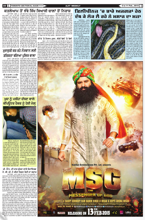 13 ਫਰਵਰੀ ਨੂੰ ਰਲੀਜ ਹੋਣ ਵਾਲੀ ਸਾਧ ਦੀ ਉਕਤ ਐਮ.ਐਸ.ਜੀ (MSG) ਫਿਲਮ
