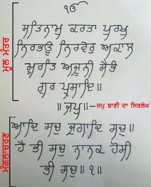 ੴ ਸਤਿ ਨਾਮੁ ਕਰਤਾ ਪੁਰਖੁ ਨਿਰਭਉ ਨਿਰਵੈਰੁ ਅਕਾਲ ਮੂਰਤਿ ਅਜੂਨੀ ਸੈਭੰ ਗੁਰ ਪ੍ਰਸਾਦਿ॥
