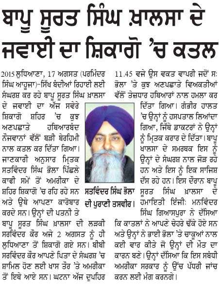 ਦੇ ਕਤਲ ਨੂੰ ਬਾਪੂ ਸੂਰਤ ਸਿੰਘ ਦੇ ਸੰਘਰਸ਼ ਨਾਲ ਜੋੜ ਕੇ ਵੇਖਿਆ ਜਾ ਰਿਹਾ ਹੈ।