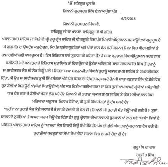 ਭਾਈ ਰਣਜੀਤ ਸਿੰਘ ਵੱਲੋਂ ਪੱਪੂ ਗੁਰਬਚਨ ਦੇ ਨਾਂ ਖੁੱਲਾ ਖੱਤ