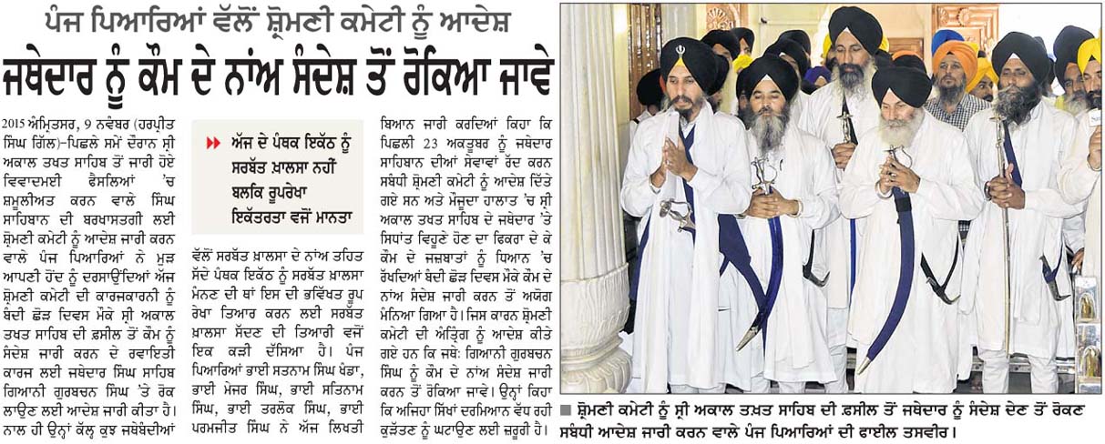 ਤਖਤ ਸਾਹਿਬ ਜੀ ਦੇ ਪੰਜ ਪਿਆਰਿਆਂ ਵਲੋਂ ਇਕ ਅਹਿਮ ਮੀਟਿੰਗ ਕੀਤੀ ਗਈ। ਜਿਸ ਵਿਚ ਪਿਛਲੇ
