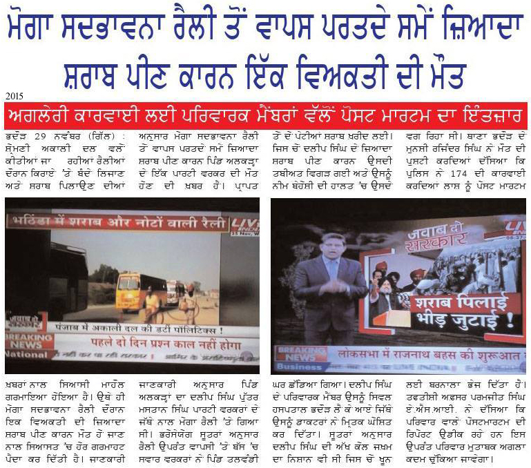 ਮੋਗਾ ਸਦਭਾਵਨਾ ਰੈਲੀ ਤੋਂ ਵਾਪਸ ਪਰਤਦੇ ਸਮੇਂ ਜ਼ਿਆਦਾ ਸ਼ਰਾਬ ਪੀਣ ਕਾਰਨ ਇੱਕ ਵਿਅਕਤੀ ਦੀ ਮੌਤ