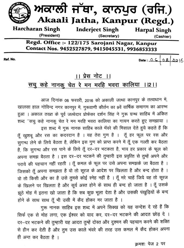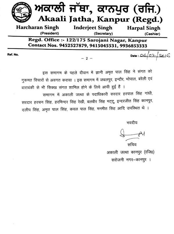 06 ਫਰਵਰੀ 2016 ਨੂੰ ਅਕਾਲੀ ਜੱਥਾ ਕਾਨਪੁਰ ਵੱਲੋਂ, ਖ਼ਾਲਸਾ ਹਾਲ