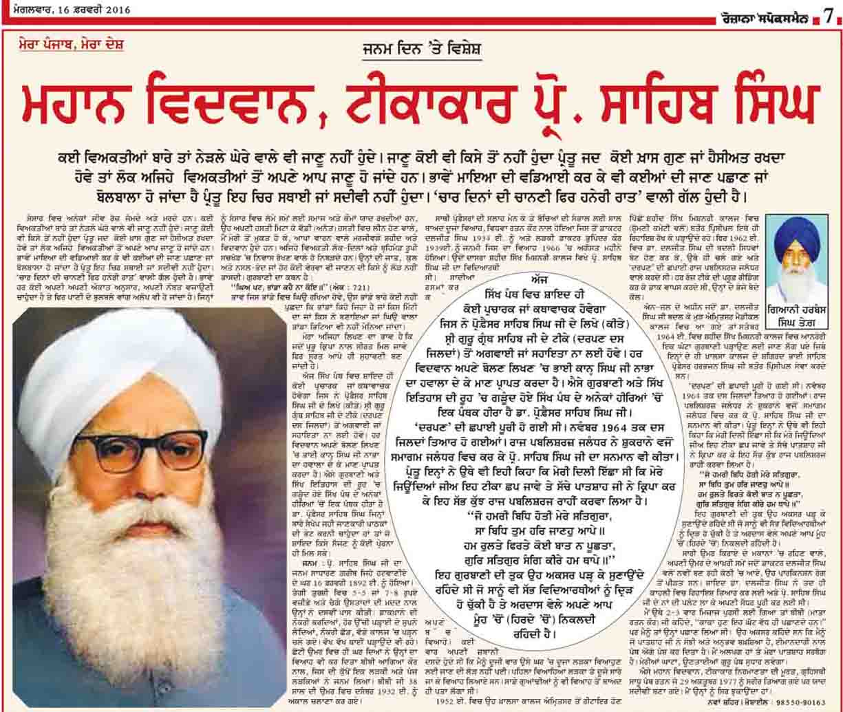 ਟੀਕਾਕਾਰ ਪ੍ਰੋ. ਸਾਹਿਬ ਸਿੰਘ -: ਗਿਆਨੀ ਹਰਬੰਸ ਸਿੰਘ ਤੇਗ਼