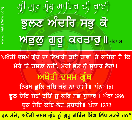 ਕੋਣ ਦੇਵੇ ਕਿ ਇਹ ਭੁੱਲੜ ਲਿਖਾਰੀ ਕੋਣ ਹੈ? ਸ਼ਾਇਦ ਦਸਮ ਗ੍ਰੰਥ ਦੇ ਲਿਖਾਰੀ ਦੇ ਇਨ੍ਹਾਂ