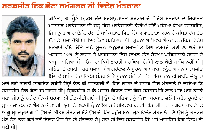 ਅਧਿਕਾਰ ਐਕਟ ਦੇ ਤਹਿਤ ਵਿਦੇਸ਼ ਮੰਤਰਾਲੇ ਵੱਲੋਂ ਦਿੱਤੀ ਗਈ ਸੂਚਨਾ ਅਨੁਸਾਰ ਸਰਬਜੀਤ