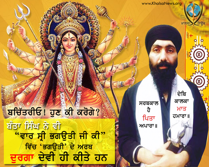 ਭਗਉਤੀ ਜੀ ਕੀ” ਵਿੱਚ ਭਗਉਤੀ ਦੇ ਅਰਥ ਦੁਰਗਾ ਦੇਵੀ ਕੀਤੇ ਹਨ। ਆਸ ਹੈ ਕਿ ਗੁਰੂ