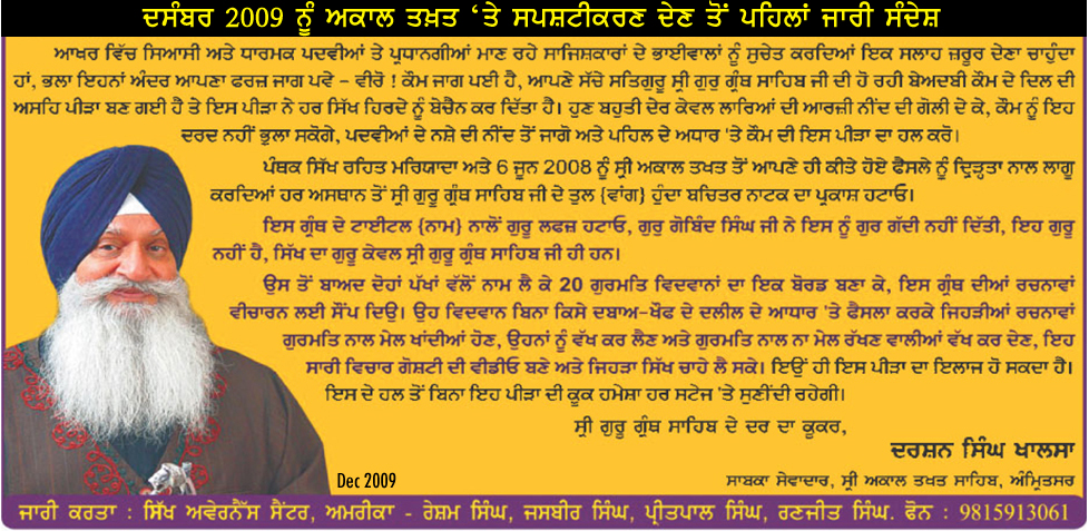 ਜਦੋਂ ਪੰਜ ਦਸੰਬਰ 2009 ਨੂੰ ਸ੍ਰੀ ਅਕਾਲ ਤਖਤ ਦੇ ਅਸਥਾਨ 'ਤੇ ਹਜ਼ਾਰਾਂ ਸੰਗਤਾਂ ਦੀ