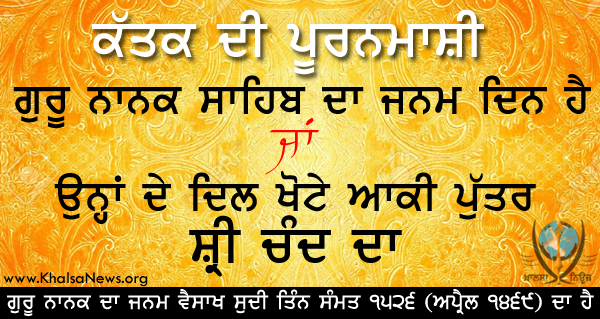 ਜਨਮ ਵੈਸਾਖ ਸੁਦੀ ਤਿੰਨ ਸੰਮਤ 1526 (ਅਪ੍ਰੈਲ ਸੰਨ 1469) ਦਾ ਹੈ, ਕੱਤਕ ਦੀ ਪੂਰਨਮਾਸ਼ੀ