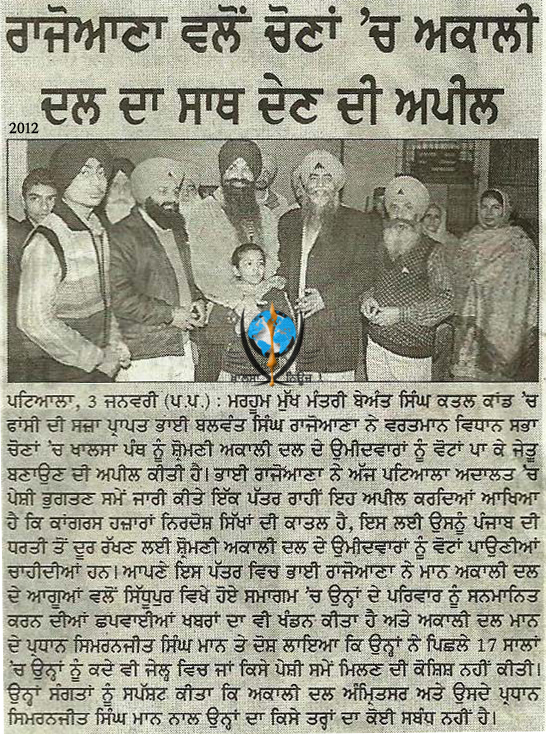 ਬਹੁਤਿਆਂ ਨੇ ਇਹ ਕਹਿਣਾ ਹੈ ਕਿ ਬਲਵੰਤ ਸਿੰਘ ਰਾਜੋਆਣਾ ਦੀ ਅਪੀਲ ਨਕਲੀ ਹੈ, ਇਹ ਚਿੱਠੀ ਨਕਲੀ ਹੈ.. ਉਹ ਜ਼ਰਾ ਇਸ ਖ਼ਬਰ ਵੱਲ ਧਿਆਨ ਦੇਣ... ਜੋ ਜਨਵਰੀ 2012 ਦੀ ਹੈ, ਜਿਸ ਵਿੱਚ ਬਲਵੰਤ ਸਿੰਘ ਰਾਜੋਆਣਾ ਬਾਦਲ ਦੇ ਪਿੱਠੂ ਪਰਮਜੀਤ ਸਿੰਘ ਨਾਲ ਖੜਾ ਹੈ, ਤੇ ਬਾਦਲ ਦਲ ਦਾ ਸਾਥ ਦੇਣ ਦੀ ਅਪੀਲ ਵੀ ਕਰ ਰਿਹਾ ਹੈ, ਜਿਸਦੀ ਖਬਰ ਖ਼ਾਲਸਾ ਨਿਊਜ਼ ਨੇ 2012 ਵਿੱਚ ਵੀ ਲਗਾਈ ਸੀ, ਜੋ ਕਿ ਥੱਲੇ ਦਿੱਤੇ ਲਿੰਕ 'ਤੇ ਦੇਖੀ ਜਾ ਸਕਦੀ ਹੈ। Click here for link of the news...