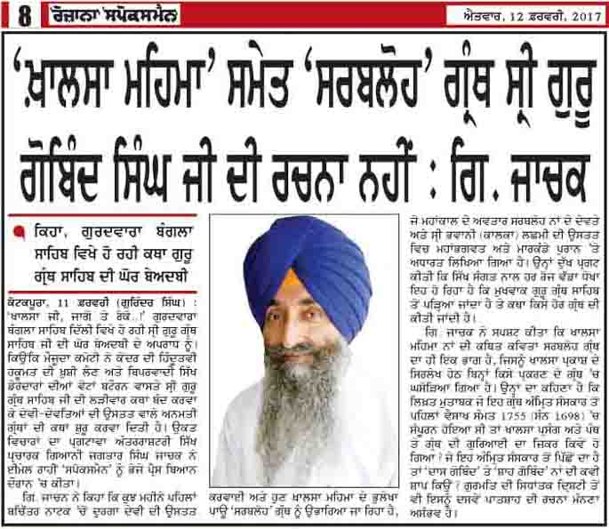 ਗਿ. ਜਾਚਕ ਨੇ ਕਿਹਾ ਕਿ ਕੁਝ ਮਹੀਨੇ ਪਹਿਲਾਂ ਬਚਿਤ੍ਰ ਨਾਟਕ ਵਿੱਚੋਂ ਦੁਰਗਾ
