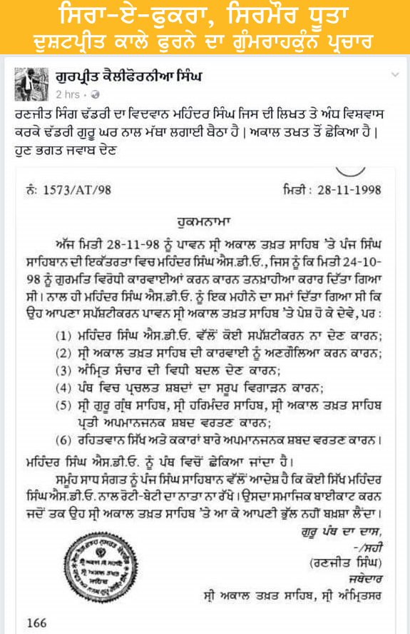 ਕਿ ਸ. ਮਹਿੰਦਰ ਸਿੰਘ ਜੋਸ਼ ਨੂੰ ਅਕਾਲ ਤਖ਼ਤ ਤੋਂ ਛਕਿਆ ਗਿਆ ਹੈ... ਤੇ ਅਖੌਤੀ ਹੁਕਮਨਾਮਾ