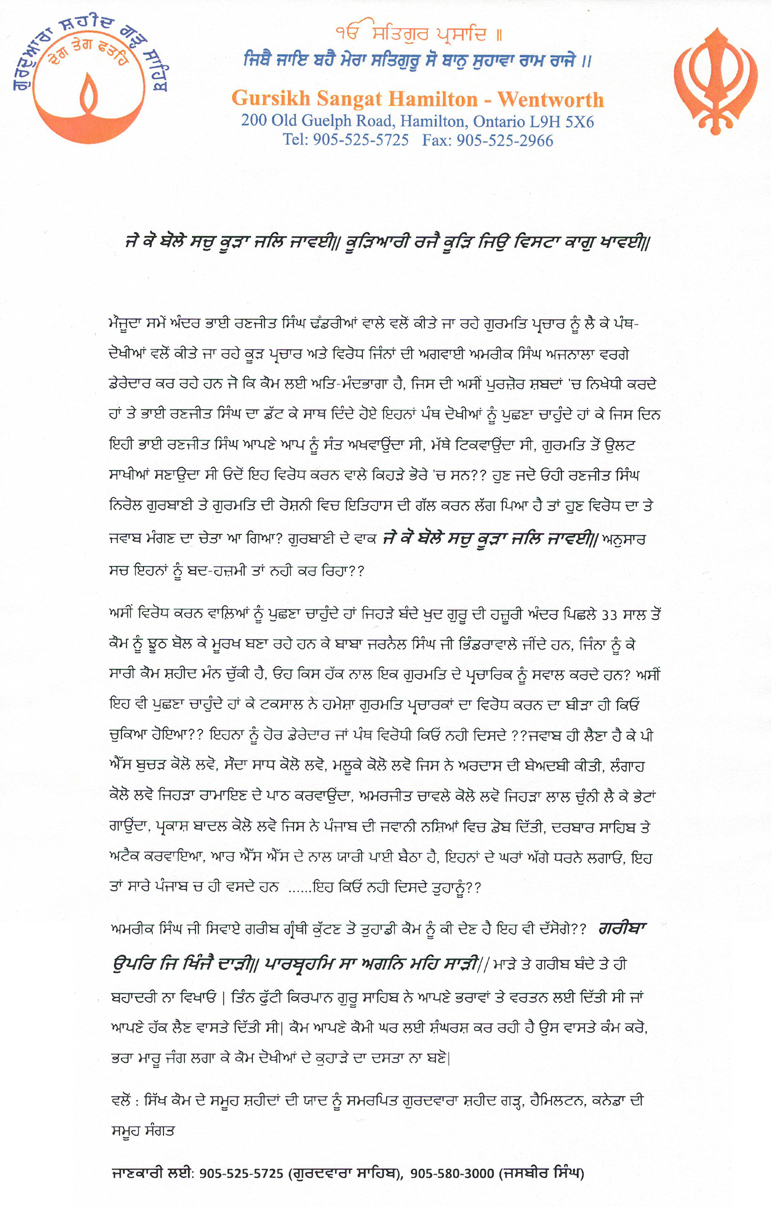 ਅਸੀਂ ਹਰ ਉਸ ਸਿੱਖ / ਸਿੱਖ ਜਥੇਬੰਦੀ ਦਾ ਸਾਥ ਦੇਵਾਂਗੇ, ਜਿਸਦਾ ਨਿਸ਼ਚਾ ਸਿਰਫ ਸ੍ਰੀ ਗੁਰੂ ਗ੍ਰੰਥ ਸਾਹਿਬ 'ਤੇ ਹੋਵੇ, ਸੱਚ ਬੋਲਣ ਅਤੇ ਸੱਚ 'ਤੇ ਪਹਿਰਾ ਦੇਣ ਦੀ ਹਿੰਮਤ ਅਤੇ ਬਾਬਰ ਦੇ ਸਾਹਮਣੇ ਖਲੋ ਕੇ ਜਾਬਰ ਕਹਿਣ ਦੀ ਹਿੰਮਤ ਰੱਖਦਾ ਹੋਵੇ।