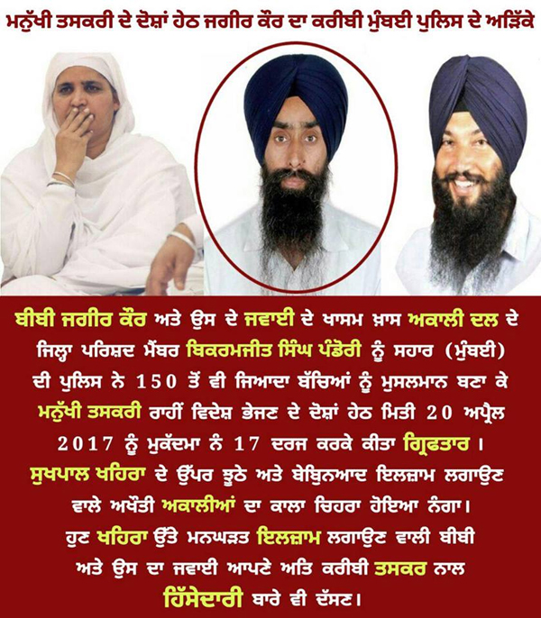 ਬੀਬੀ ਜਗੀਰ ਕੌਰ ਅਤੇ ਉਸ ਦੇ ਜਵਾਈ ਦੇ ਬੇਹੱਦ ਨਜਦੀਕੀ ਬਿਕਰਮਜੀਤ ਸਿੰਘ ਪੰਡੋਰੀ ਜਿਲਾ ਪਰਿਸ਼ਦ ਮੈਂਬਰ ਨੂੰ ਸਹਾਰ ਪੁਲਿਸ (ਮੁੰਬਈ) ਨੇ 150 ਤੋਂ ਵੀ ਜਿਆਦਾ ਬੱਚਿਆਂ ਨੂੰ ਮੁਸਲਮਾਨ ਬਣਾ ਕੇ ਮਨੁੱਖੀ ਤਸਕਰੀ ਰਾਹੀਂ ਵਿਦੇਸ਼ ਭੇਜਣ ਦੇ ਦੋਸ਼ਾਂ ਹੇਠ ਗਿ੍ਰਫਤਾਰ ਕੀਤਾ। ਕੀ ਹੁਣ ਬੀਬੀ ਅਤੇ ਉਸ ਦਾ ਜਵਾਈ ਤਸਕਰ ਬਿਕਰ ਪੰਡੋਰੀ ਨਾਲ ਆਪਣੀ ਹਿੱਸੇਦਾਰੀ ਦਾ ਵੀ ਲੋਕਾਂ ਸਾਹਮਣੇ ਖੁਲਾਸਾ ਕਰਨਗੇ?