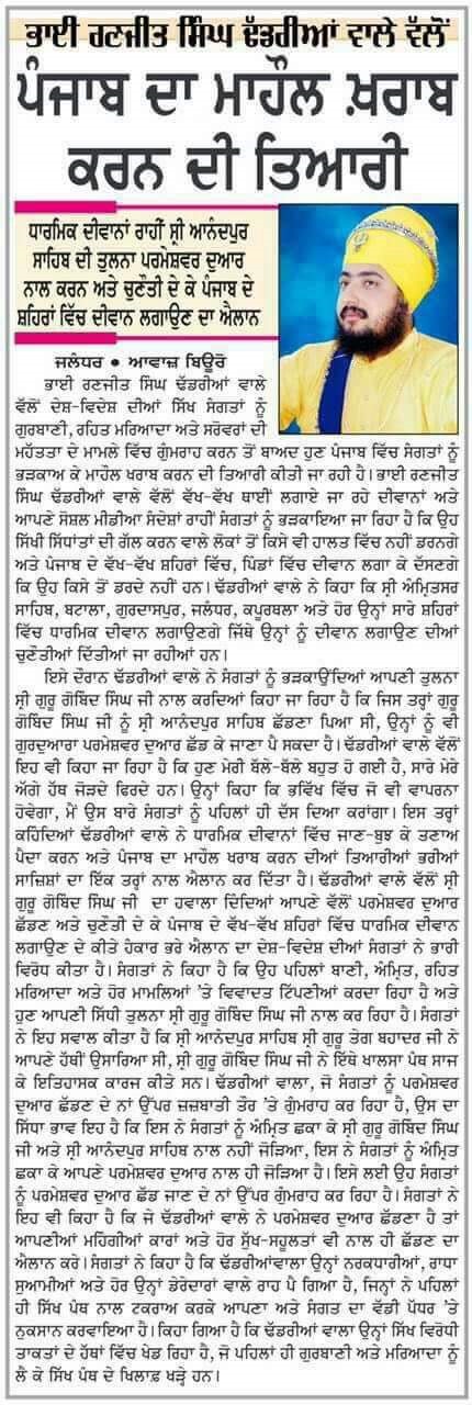 " ਭਾਈ ਰਣਜੀਤ ਸਿੰਘ ਖਾਲਸਾ ਢੱਡਰੀਆਂ ਵਾਲਿਆਂ ਵੱਲੋਂ ਪੰਜਾਬ