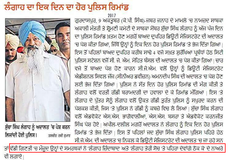 "ਲੰਗਾਹ ਜ਼ਿੰਦਾਬਾਦ" ਅਤੇ "ਲੰਗਾਹ ਤੇਰੀ ਸੋਚ 'ਤੇ ਪਹਿਰਾ ਦਿਆਂਗੇ ਠੋਕ ਕੇ" ਦੇ ਨਾਅਰੇ ਲੱਗੇ