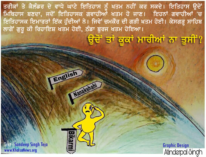 "ਵਿਦਵਾਨ"? ਆਖਦਾ ਭਈ ਕਲੰਡਰ ਬਦਲਣ ਨਾਲ ਇਤਿਹਾਸ ਖਤਮ ਹੋਜੂਗਾ। ਤਰੀਕਾਂ ਹੀ ਇਤਿਹਾਸ ਬਣਾਉਂਦੀਆਂ। ਗੁਰੂ ਸਾਹਿਬ ਨੇ ਇਹੀ ਬਿਕ੍ਰਮੀ ਕਲੰਡਰ ਵਰਤਿਆ ਸੀ ਹੁਣ ਕੀ ਆਖਰ ਆ ਗਈ ਕਿ ਬਦਲਣਾ ਪਿਆ ?