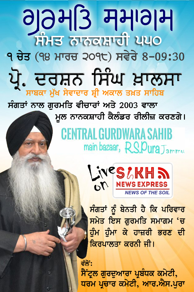 ਮੂਲ ਨਾਨਕਸ਼ਾਹੀ ਕੈਲੰਡਰ ਅਨੁਸਾਰ 14-03-2018 ਦਿਨ ਬੁੱਧਵਾਰ ਨੂੰ ਨਵਾਂ ਸਾਲ ਅਰੰਭ ਹੋ ਰਿਹਾ ਹੈ, ਜਿਸ ਦੇ ਸੰਬੰਧ ਵਿੱਚ ਇੱਕ ਵਿਸ਼ੇਸ਼ ਗੁਰਮਤਿ ਸਮਾਗਮ ਸੈਂਟਰਲ ਗੁਰਦੁਆਰਾ ਮੇਨ ਬਾਜ਼ਾਰ ਆਰ.ਐਸ.ਪੂਰਾ ਵਿੱਖੇ ਹੋ ਰਿਹਾ ਹੈ, ਜਿਸ ਵਿਚ ਸਿੱਖ ਕੌਮ ਦੇ ਮਹਾਨ ਵਿਦਵਾਨ ਪ੍ਰੋ. ਦਰਸ਼ਨ ਸਿੰਘ ਜੀ ਵਿਸ਼ੇਸ਼ ਤੌਰ 'ਤੇ ਪਹੁੰਚ ਰਾਹੇ ਹਨ। ਸਮਾਗਮ ਦਾ ਸਮਾਂ 14-03-2018 ਸਵੇਰੇ 7:30 ਤੋਂ 9 ਵਜੇ ਤੱਕ ਹੈ ਜੀ।