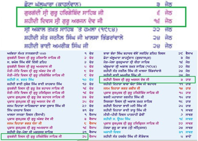 ਅਤੇ ਗੁਰੂ ਅਰਜਨ ਸਾਹਿਬ ਜੀ ਦਾ ਸ਼ਹੀਦੀ ਦਿਵਸ 16 ਜੇਠ ਵਿਖਾਏ ਗਏ ਸਨ ਜਿਸ ਮੁਤਾਬਿਕ