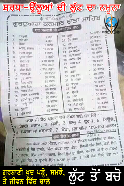 ਸ਼ਰਧਾ-ਉੱਲੂਆਂ ਦੀ ਲੁੱਟ ਦਾ ਨਮੂਨਾ - ਸੰਪਾਦਕ ਖ਼ਾਲਸਾ ਨਿਊਜ਼ 29 Jul 2019 ਗੁਰਬਾਣੀ ਪਾਠ ਕਰਣ ਲਈ ਨਹੀਂ ਬਣੀ, ਪਾਠ ਦਾ ਮਤਲਬ ਹੈ Lesson, ਗੁਰਬਾਣੀ ਤੋਂ Lesson ਲਉ, ਸਿੱਖਿਆ ਲਉ, ਅਤੇ ਜੀਵਨ ਵਿੱਚ ਢਾਲੋ, ਤੇ ਜੀਵਨ ਸੁੱਚਜਾ ਬਣਾਉ।