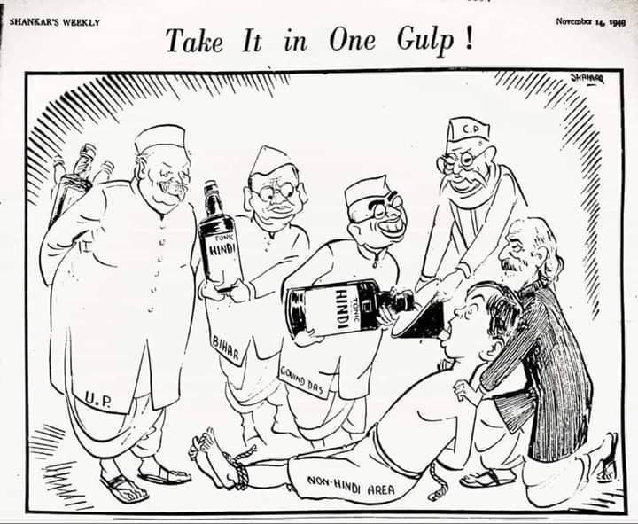 ਪਰ ਸਿੱਧੇ ਟਕਰਾਅ ਤੋਂ ਇਕ ਦਹਾਕਾ ਪਹਿਲਾਂ ਸ਼ੰਕਰ ਇਹ ਕਾਰਟੂਨ ਬਣਾ ਰਹੇ ਸਨ। ਇਹ ਕਾਰਟੂਨ ਪੰਜਾਬ ਬਾਰੇ ਨਹੀਂ ਸੀ। ਇਸ ਕਾਰਟੂਨ ਵਿੱਚ ਬਿਹਾਰ ਅਤੇ ਯੂਪੀ ਦੇ ਸਿਆਸਤਦਾਨ ਦਿਖਾਏ ਗਏ ਨੇ ਜੋ ਇਕ ਬੰਦੇ ਨੂੰ ਫੜ੍ਹ ਕੇ ਧੱਕੇ ਨਾਲ ਹਿੰਦੀ ਦੀਆਂ ਘੁੱਟਾਂ ਪਿਆ ਰਹੇ ਨੇ।